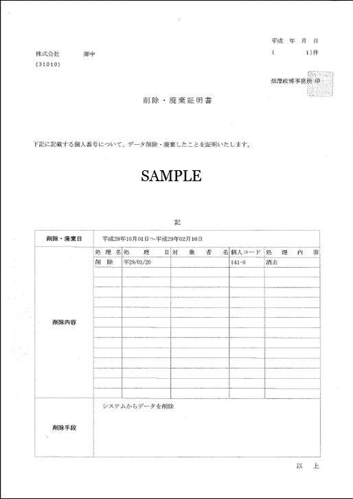 ■法定期限経過後は業務ソフトからマイナンバーを削除し、必要に応じ「削除・廃棄証明書」を発行します。